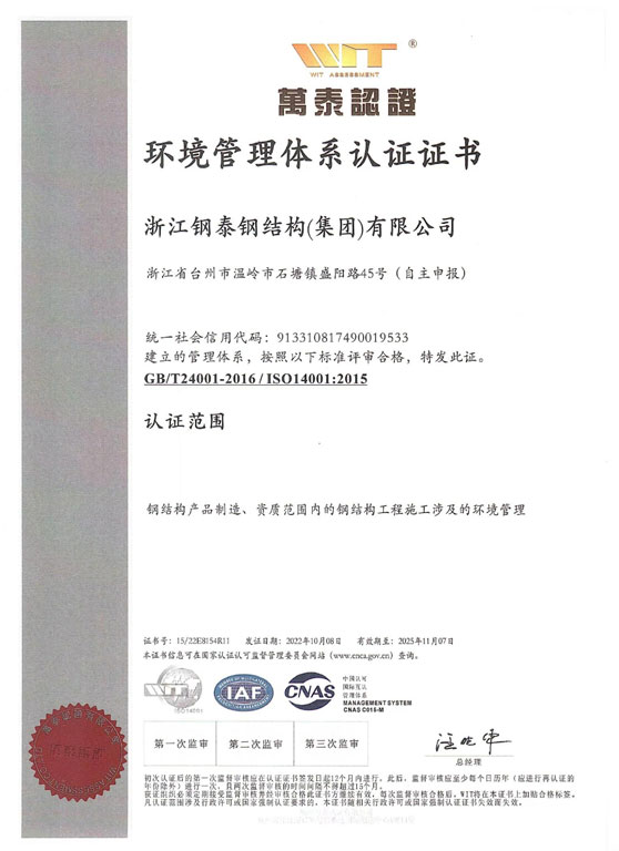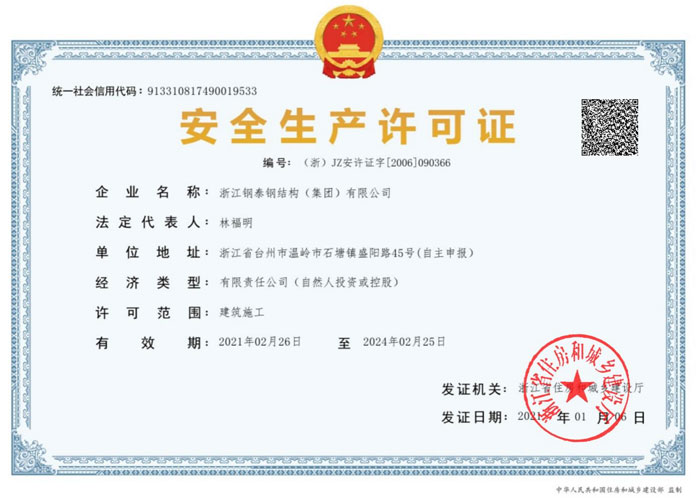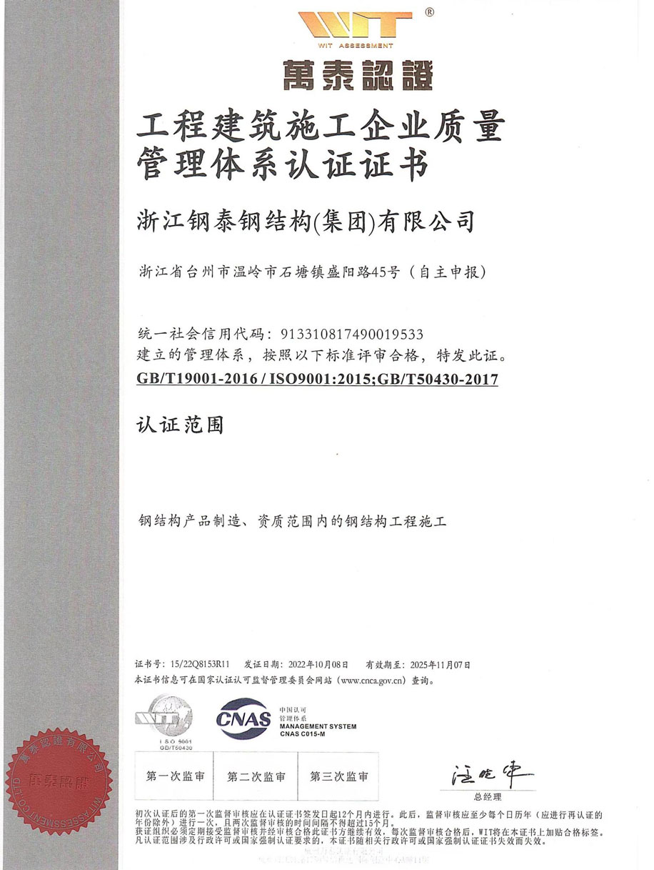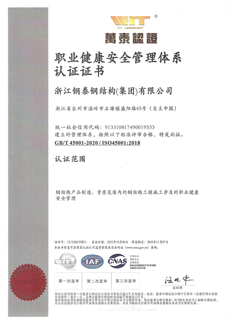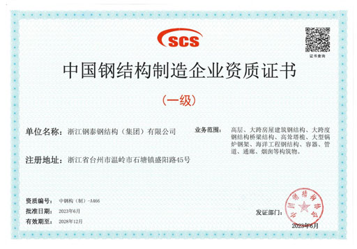 鋼泰鋼構(gòu)具有建筑工程施工總承包二級資質(zhì)、電力施工總承包二級資質(zhì)、建筑行業(yè)工程設(shè)計(jì)乙級資質(zhì)、鋼結(jié)構(gòu)工程專業(yè)承包一級資質(zhì)、建筑幕墻工程專業(yè)承包一級資質(zhì)、中國鋼結(jié)構(gòu)制造企業(yè)一級資質(zhì)、消防設(shè)施工程專業(yè)承包二級資質(zhì)、建筑裝修裝飾工程專業(yè)承包二級資質(zhì),并已通過ISO9001:2000質(zhì)量管理體系、ISO14001:2004環(huán)境管理體系、GB/T28001:2001職業(yè)健康安全管理體系等三標(biāo)一體化管理體系認(rèn)證。